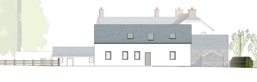 A simple material palette has been chosen to help the new building blend with the existing farm buildings, using white render for most of the external walls and natural blue slate for the roof, with some areas of external wall faced with natural stone to add decorative variety while continuing the traditional agricultural style.